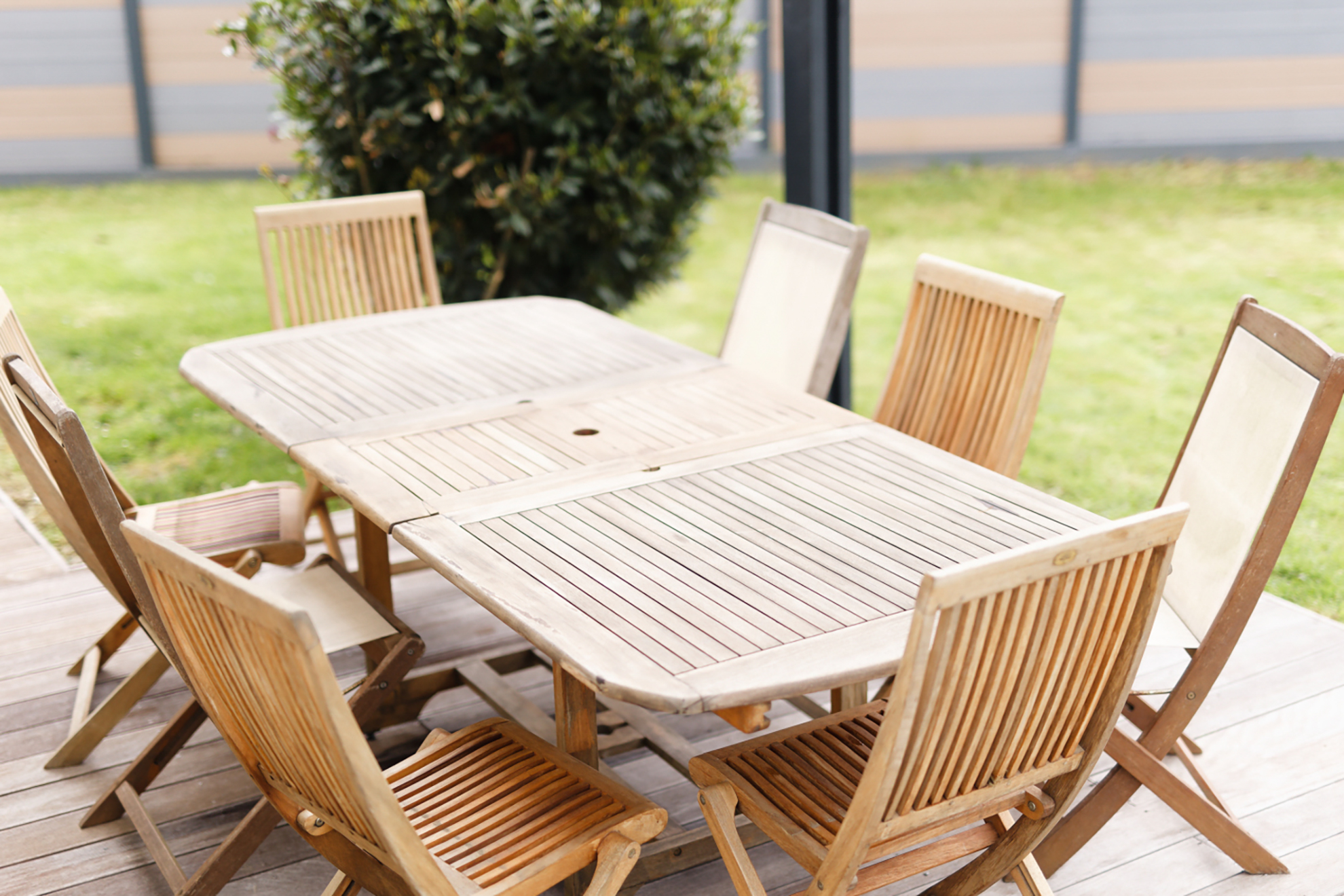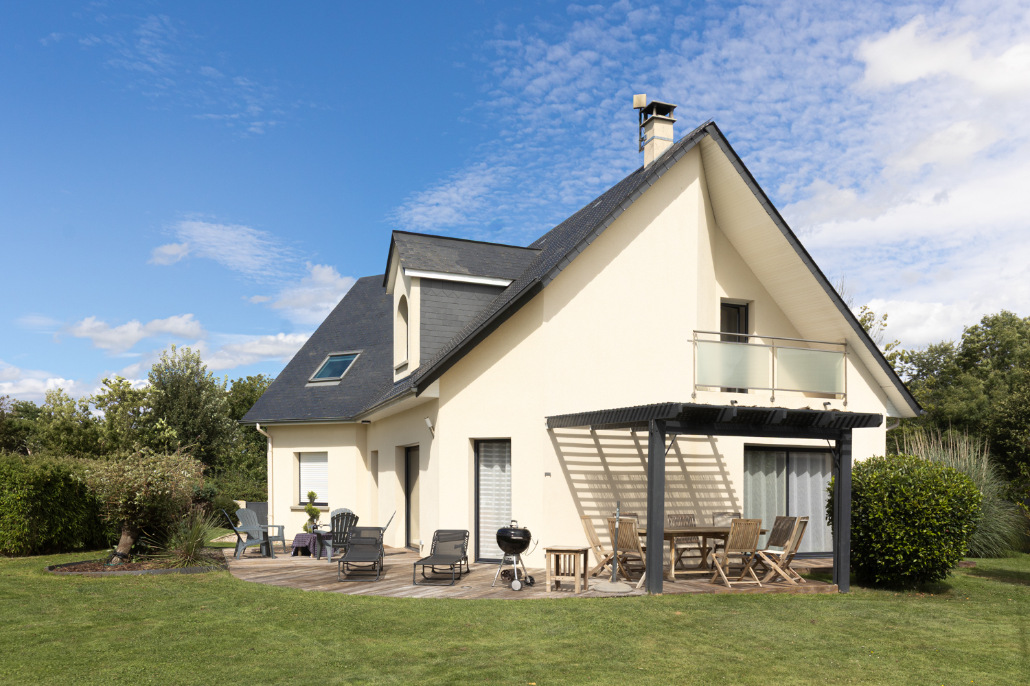 Grande terrasse de 80 m² exposée plein sud, équipée d'une pergola, d'un barbecue et de bains de soleil. Deux espaces — salon et table avec chaises — sont aménagés sur cette terrasse. Une balançoire. Jardin entièrement clos avec portail électrique. Parking intérieur pour 3 voitures.